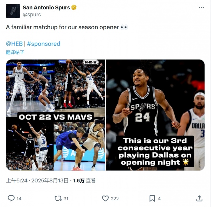 老对手了!马刺官推:新赛季我们将连续第三年在揭幕战对阵独行侠