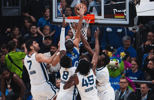 转换进攻布莱克持球过半场后见阿尔达马放两步防突放投,立即使用胯下拉回衔接撤步持球三分惩罚。