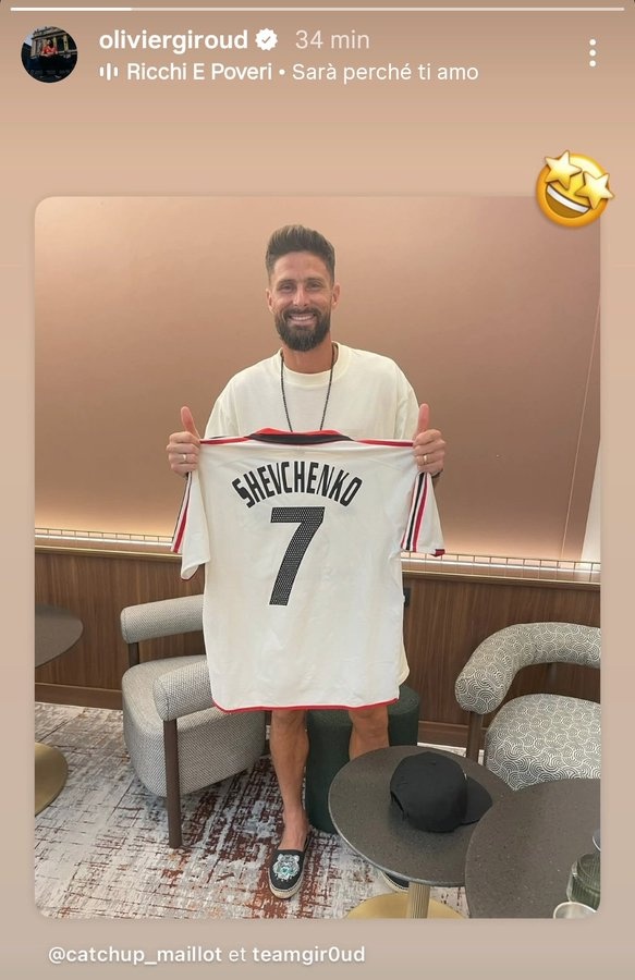 8月16日最新消息,前AC米兰前锋吉鲁在个人社交平台分享了一张珍贵礼物——乌克兰传奇射手舍甫琴科的7号红黑战袍。