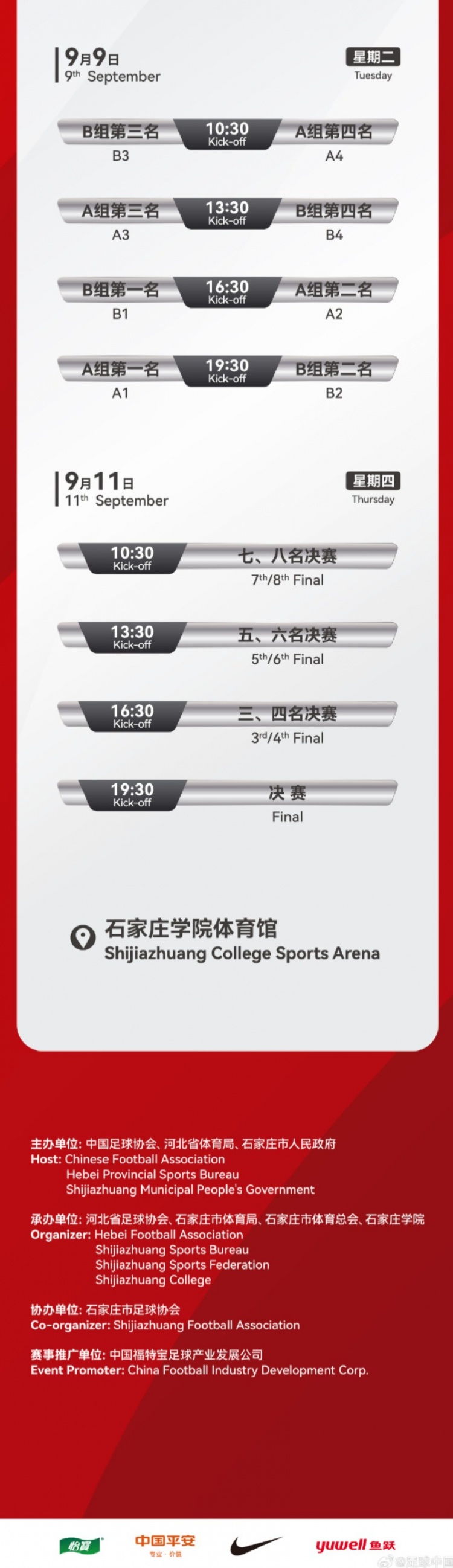 8月28日官方讯 中国五人制男足国际邀请赛将于九月在石家庄举行,东道主中国队将与阿联酋、丹麦、韩国等多支队伍展开较量。“北人集团”石家庄五人制足球国际邀请赛完整赛程正式公布!参赛队伍包括中国、柬埔寨、丹麦、印度尼西亚、韩国、缅甸、新西兰及阿联酋的男子五人制足球队,赛事将于九月在河北石家庄火...